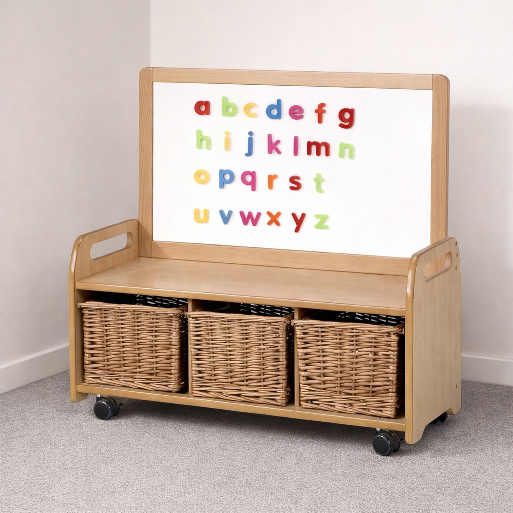 Millhouse Mobile Low Level Storage Unit & Magnetic Panel - 3 x Wicker Trays